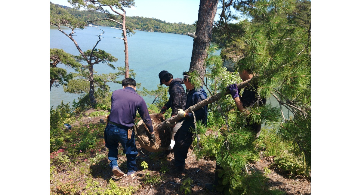月に1回、松島湾の無人島整備、雑木刈りをする事で新たに芽生えた松の育成に取り組んでおります。